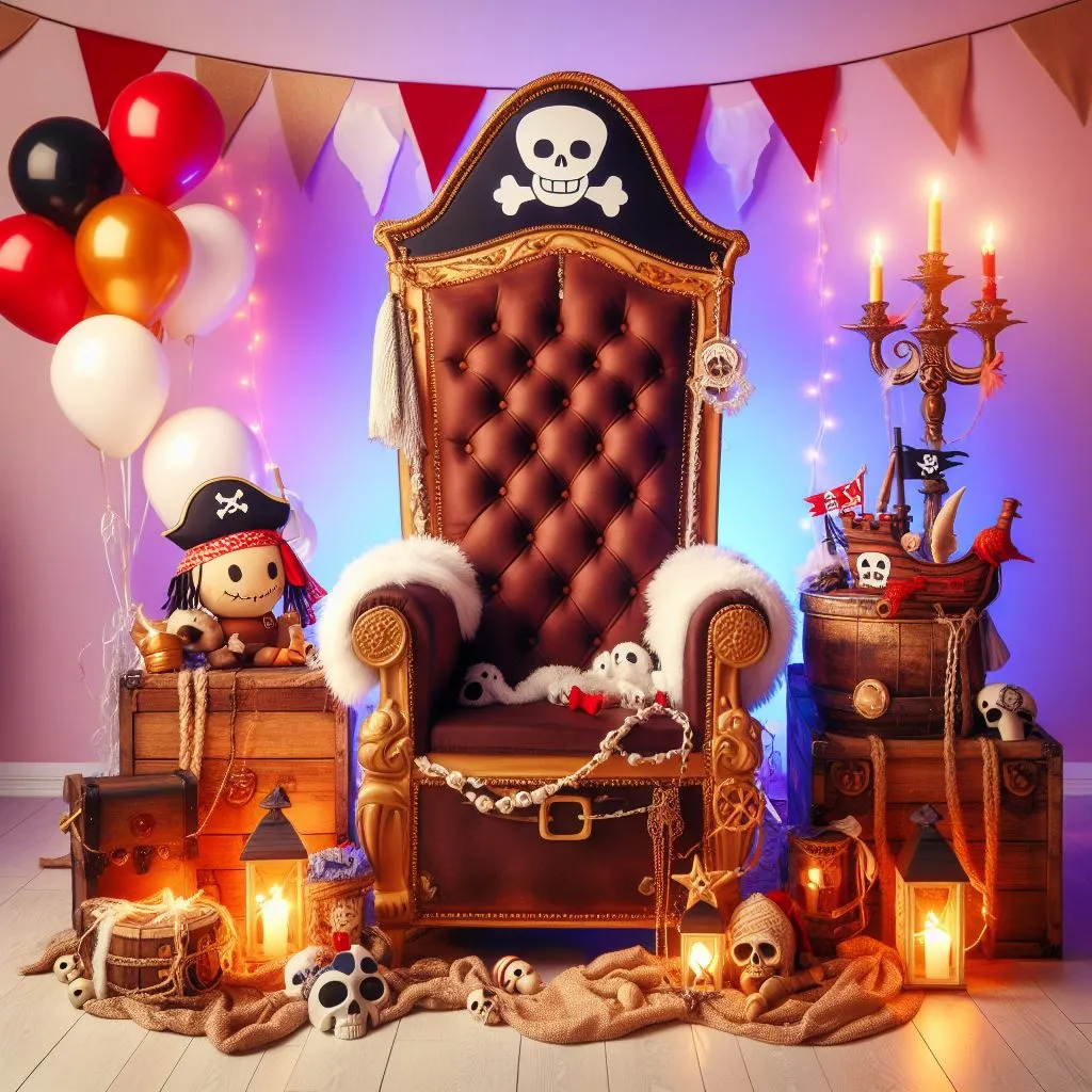 Craft a worthy captain's seat for the birthday buccaneer! A weathered chair draped in pirate flags and a treasure chest for loot will make a fine seat for the day's captain.