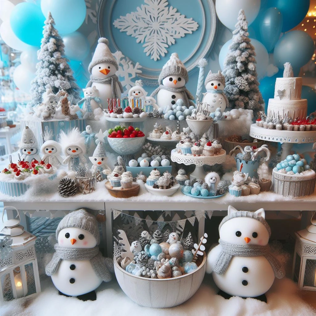 Create a feast table adorned with snowflake accents and frosty hues! Snowball cookies, hot cocoa stations, and sandwiches shaped like snowmen will delight the young partygoers.