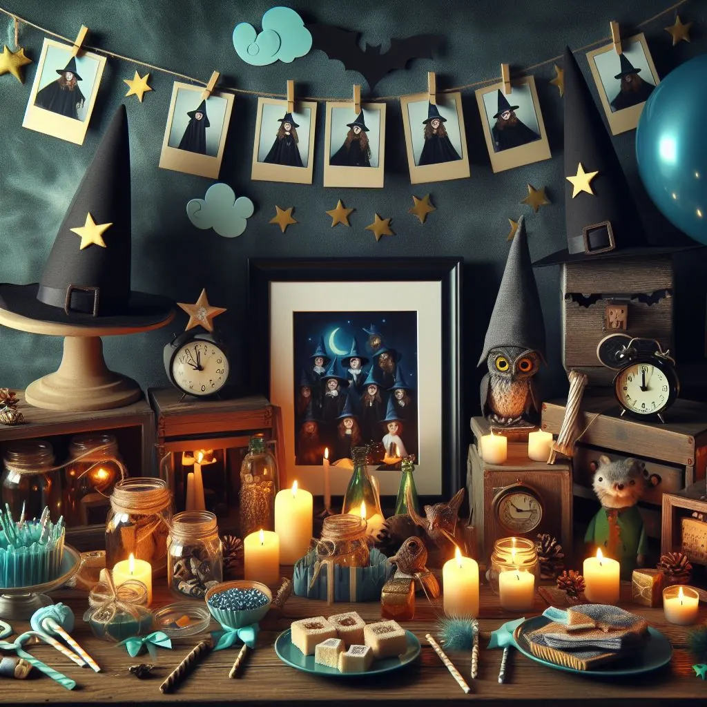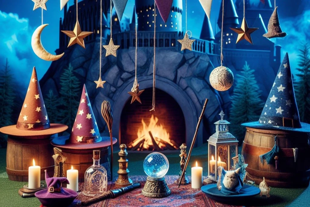 Spellbinding Setup:Transform your party realm into a mystical haven! Deck the halls with twinkling stars, draped fabrics in deep hues, and flickering candles for that bewitching touch.
